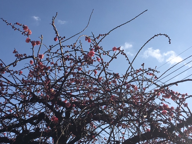 庭の枝垂れ梅が、今年も咲きました。 さざんかが咲き終わって、まだ芝生の新芽がでないうちに咲きます。 モノクロの世界に色が付けられたように、急